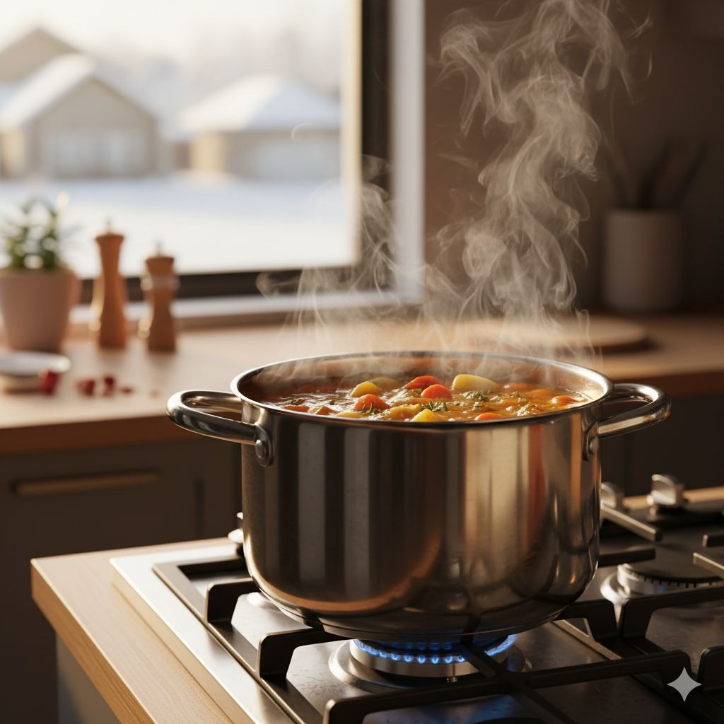 Evoke a sense of warmth and comfort with this inviting stock photo of a steaming pot of soup in a cozy kitchen. Perfect for winter marketing campaigns, this image helps real estate agents connect with clients on an emotional level, showcasing the heart of a home.