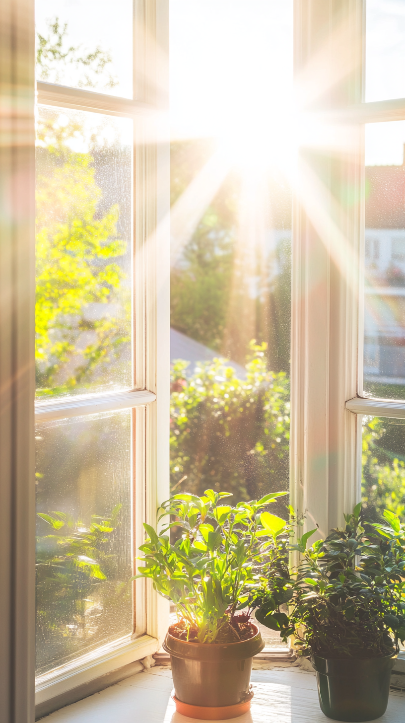 This serene vertical image captures warm, golden sunlight dramatically streaming through a partially open white-framed window. Vibrant green outdoor foliage is softly blurred in the background, creating a refreshing natural backdrop for two healthy potted houseplants resting on the white windowsill. The strong sun rays create a bright, optimistic, and inviting atmosphere, enhanced by the fresh green and warm golden hues. This image is perfect for evoking feelings of comfort, growth, and natural light, making it ideal for home decor blogs, wellness websites, marketing campaigns promoting natural living or sustainability, social media posts, or any content requiring a bright, peaceful, and cozy indoor scene.