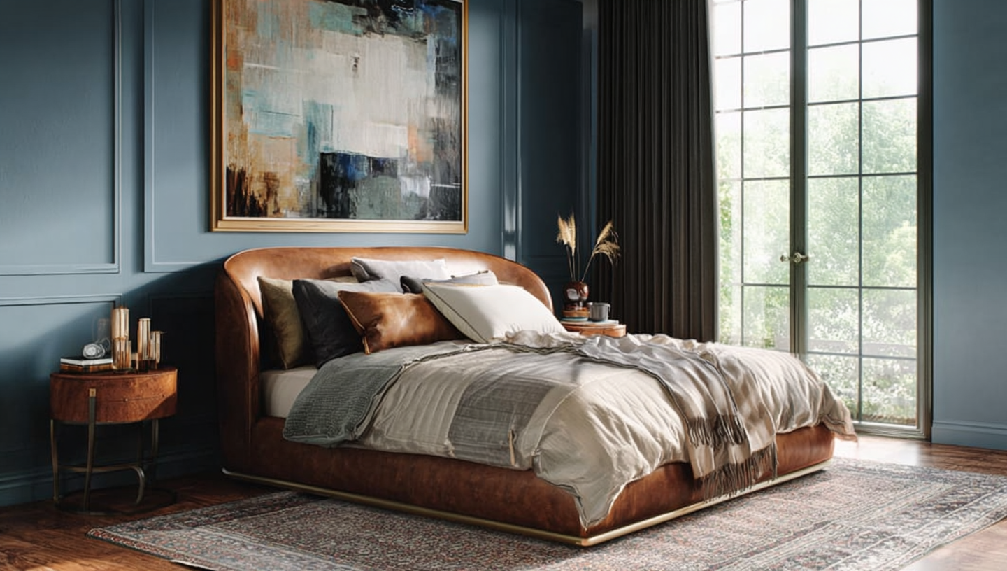 Luxurious Modern Bedroom with Blue Walls and Leather Bed
