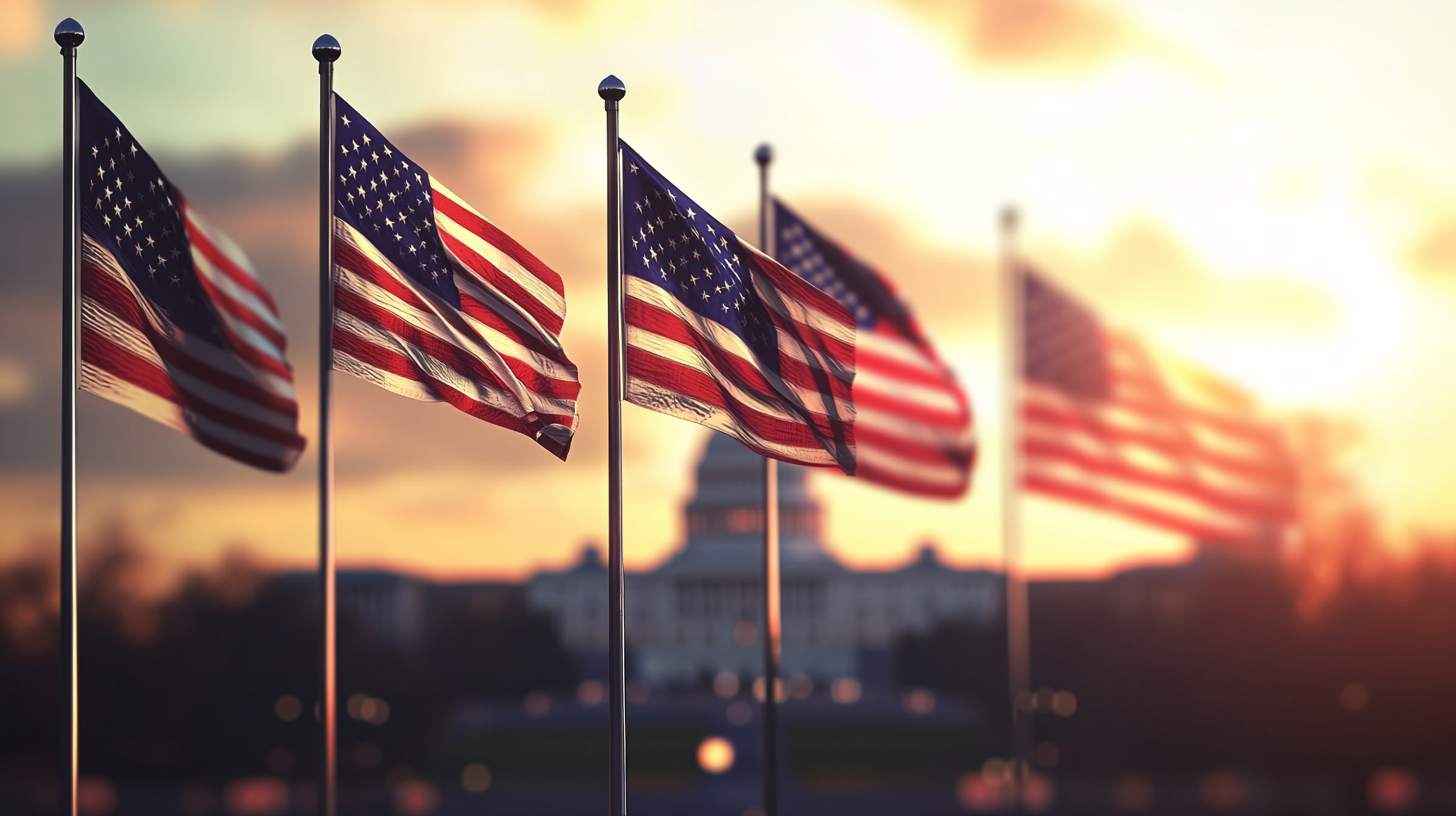 Showcase your commitment to the American dream with this inspiring image of US flags against a stunning sunset backdrop. Perfect for real estate marketing materials, this image conveys trust, stability, and a dedication to helping families find their place in the nation's story.