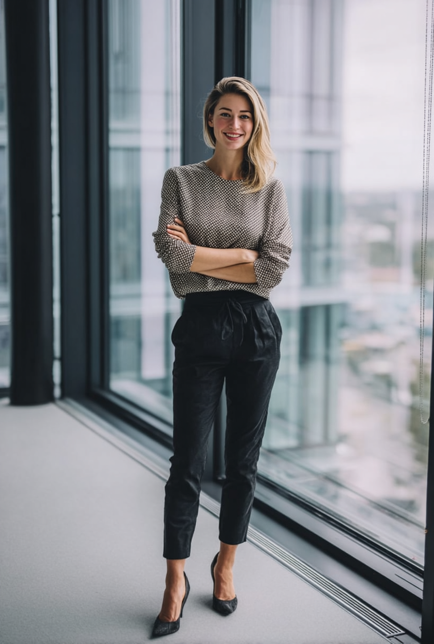 Elevate your personal brand with this high-quality stock photo of a confident, professional woman in a modern high-rise office. Perfect for real estate agents who want to project an image of success, approachability, and modern sophistication across their website and marketing materials.