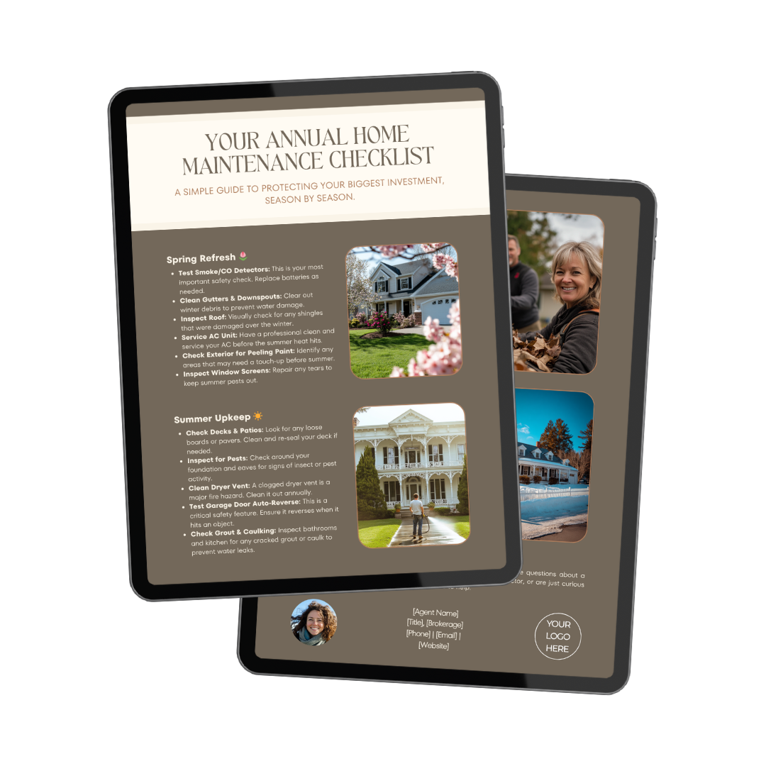 Provide ongoing value to homeowners with this annual home maintenance checklist. This guide breaks down seasonal tasks, helping clients protect their investment and positioning you as a lifelong real estate resource.