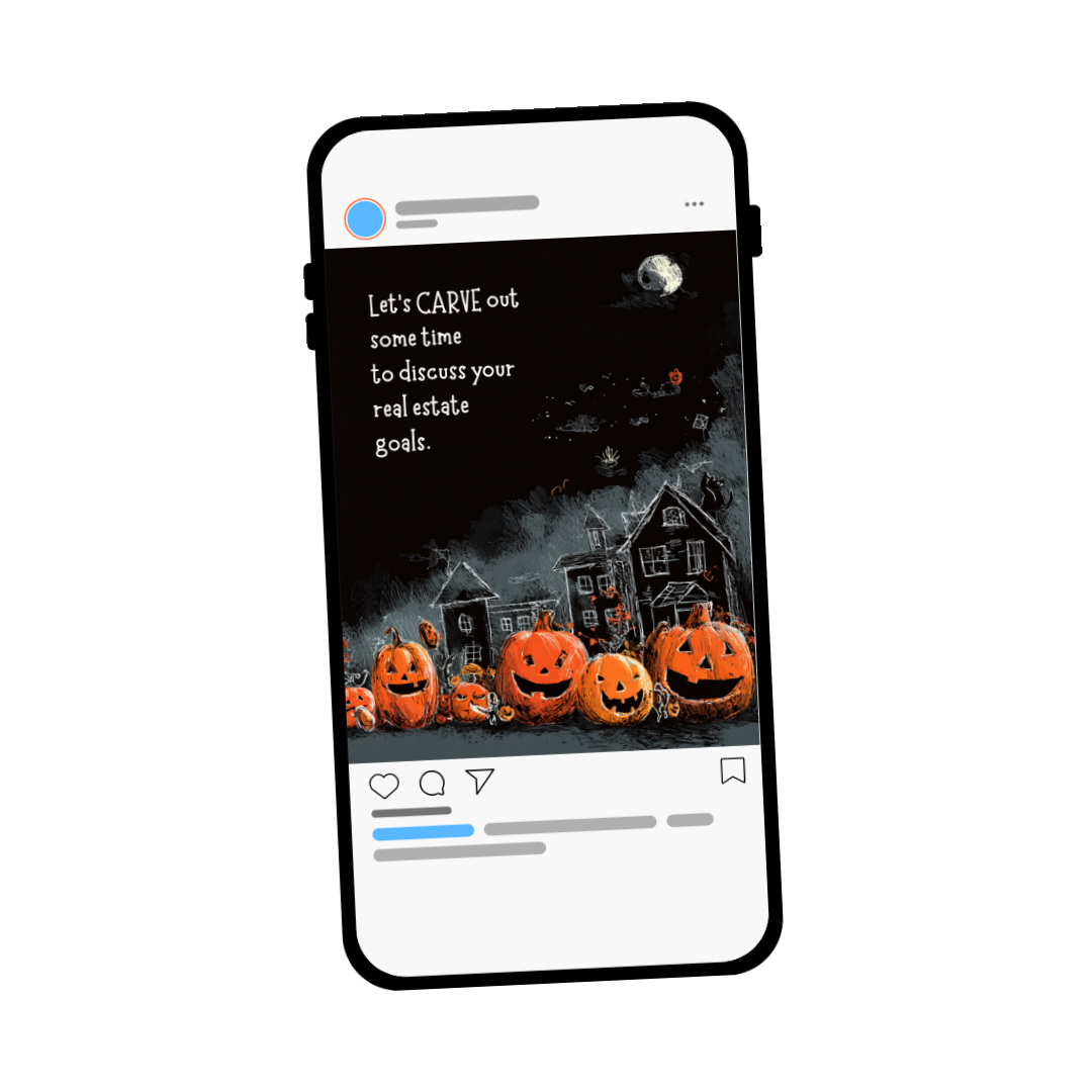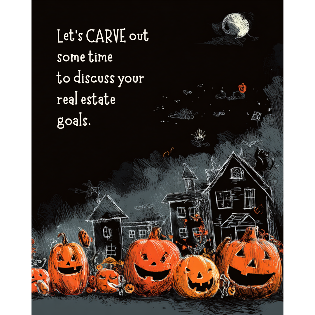 Use this fun, Halloween-themed quote graphic to encourage your audience to "carve out time" for their real estate goals. It's a playful way to prompt action and remind them that you're available to help with their home search or sale.