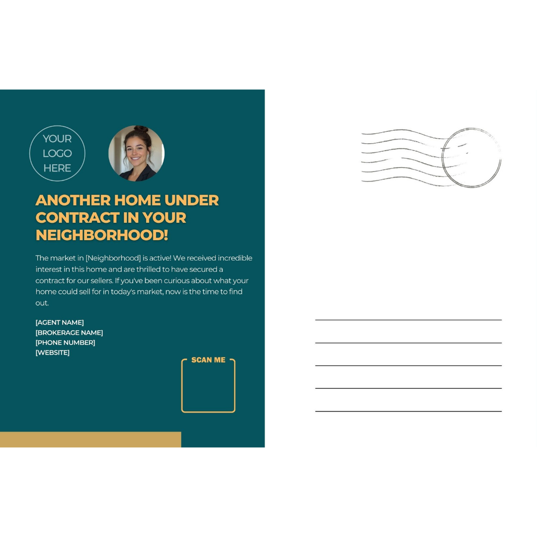 Leverage your success to generate new seller leads. This 6x9" jumbo postcard announces that a nearby home is under contract, creating social proof and a powerful call to action for neighbors who may be considering selling.