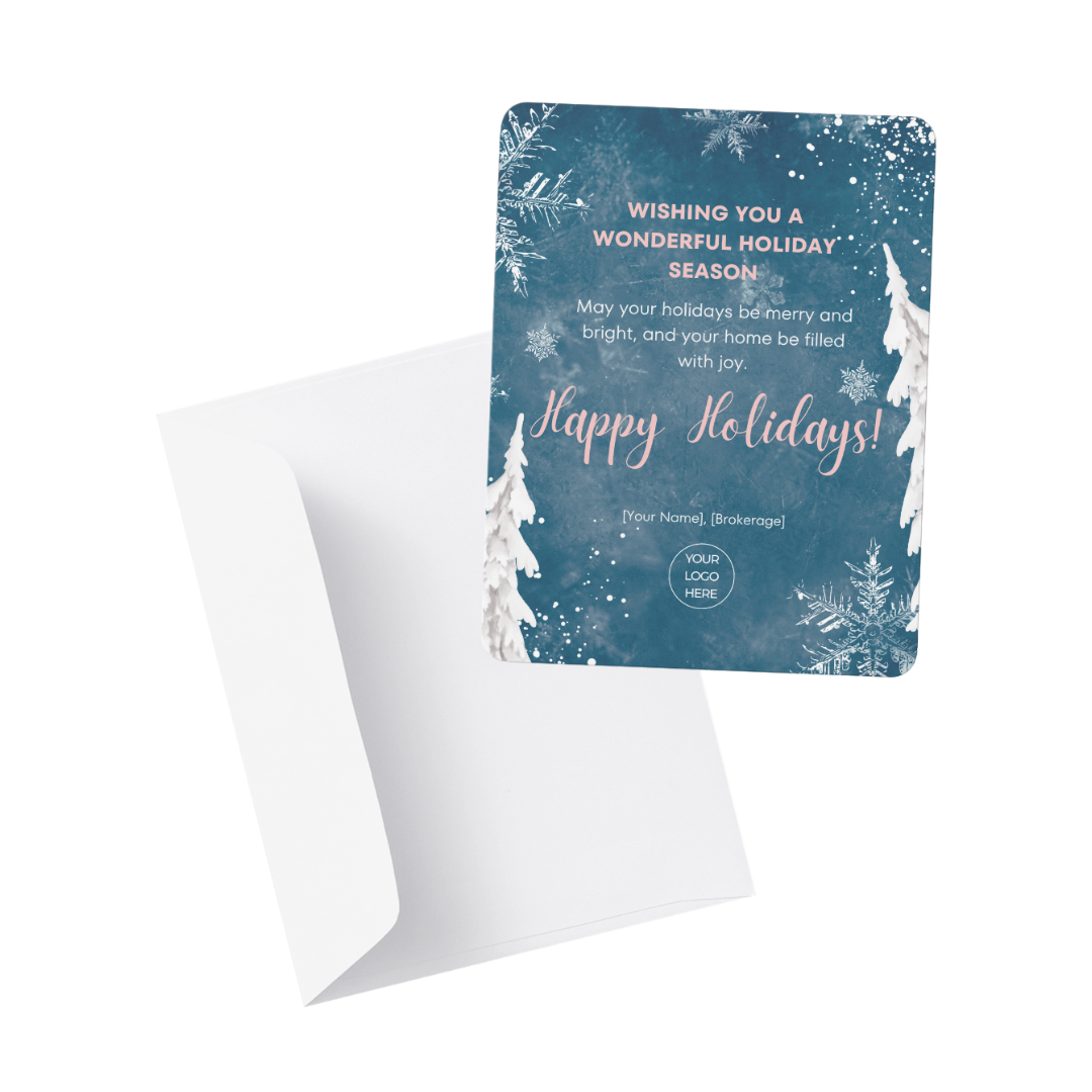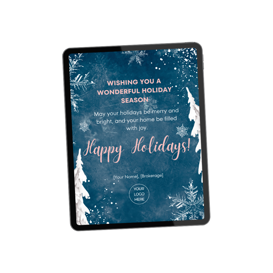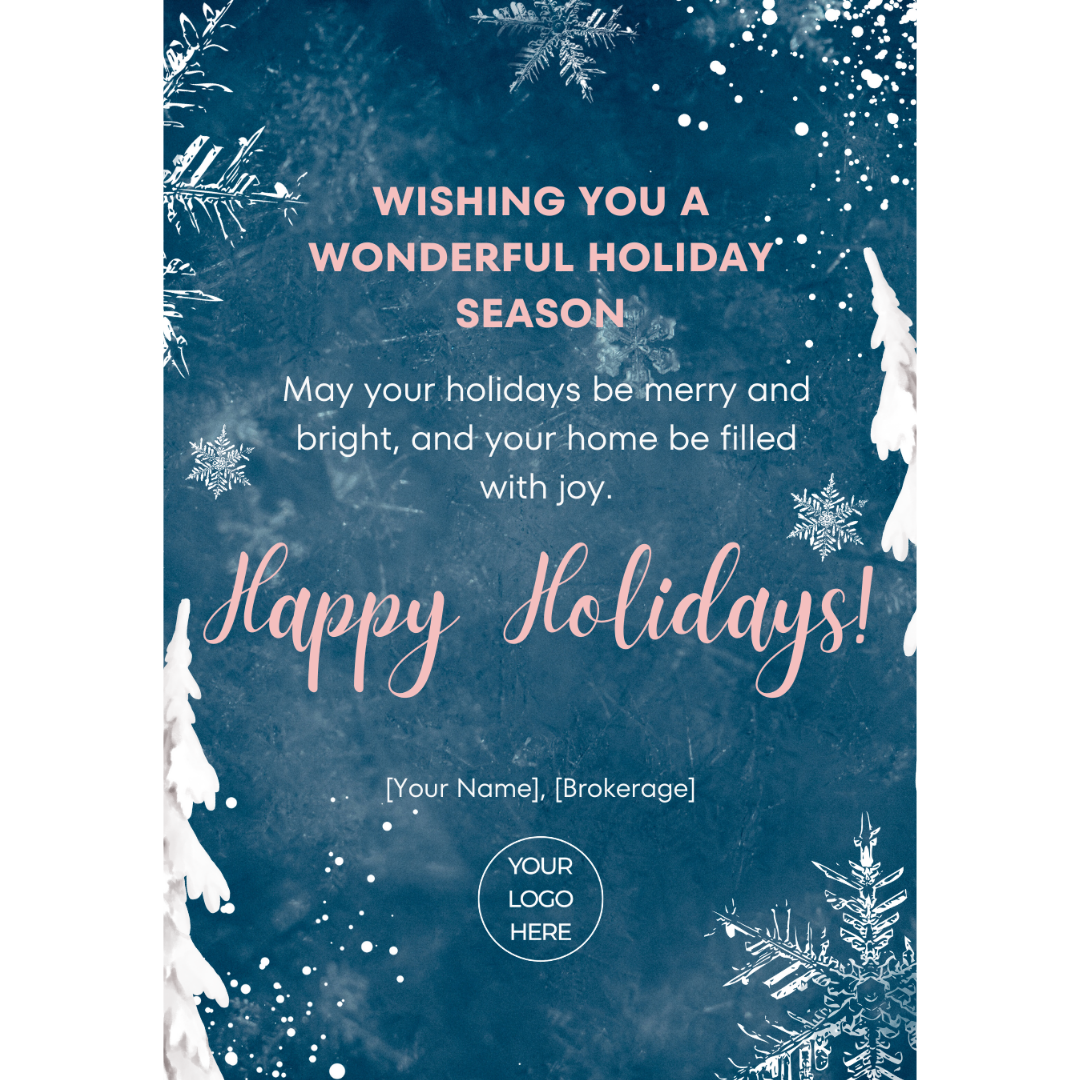 Send warm wishes for the winter holiday season with this e-card template. It's a thoughtful, non-denominational way to connect with clients, sphere of influence, and local businesses, spreading cheer and staying top-of-mind.