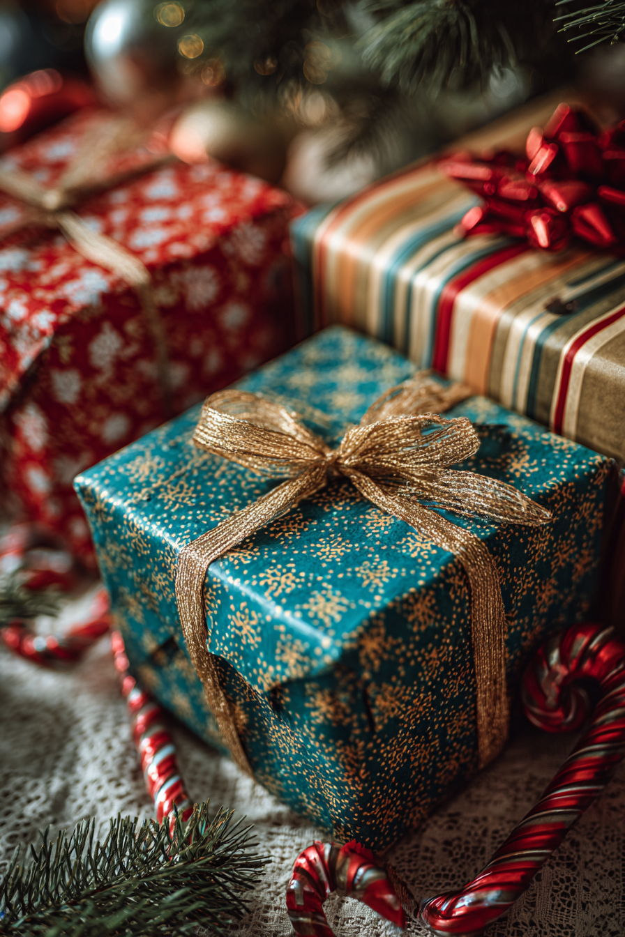 This heartwarming close-up captures a beautifully arranged display of Christmas presents, with a prominent teal gift adorned with shimmering gold snowflake-like patterns and a golden ribbon bow in sharp focus. Nestled around it are other elegantly wrapped gifts in red and white patterns, and gold and brown stripes with a red bow, all resting on a cozy, light-colored lace fabric. The scene is further enhanced with fresh green fir branches and classic red and white candy canes, while soft, warm lighting creates an enchanting bokeh effect from blurred background lights and ornaments. Ideal for holiday marketing campaigns, website headers, social media posts, or blog features on gifting and festive celebrations, this image evokes a strong sense of joy, tradition, and warmth.