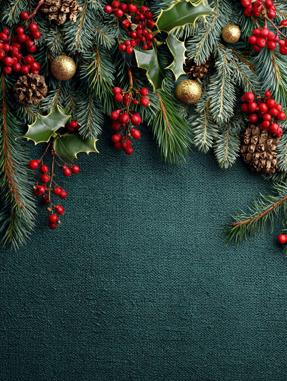 A vibrant top-down shot features a lush border of traditional Christmas elements, including deep green evergreen fir branches, bright red berries, sharp-edged holly leaves, rustic pinecones, and sparkling gold glitter ornaments, artfully arranged along the top and upper sides. The festive display rests on a rich, dark teal textured fabric background, providing generous copy space below and creating a cozy, elegant, and timeless holiday atmosphere. The classic color palette of deep greens, vibrant reds, warm browns, and shimmering gold, combined with soft, even lighting, evokes traditional warmth and holiday cheer. Perfect for seasonal promotions, greeting cards, website banners, social media posts, gift guides, event invitations, or any design needing a sophisticated yet inviting festive touch.