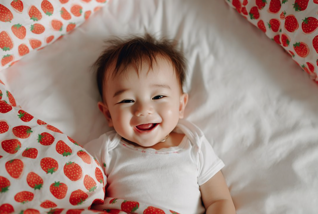This heartwarming overhead shot captures an adorable baby with dark hair lying comfortably on soft white bedding, beaming with a wide, infectious smile. Dressed in a simple white short-sleeved onesie, the baby is delightfully framed by cheerful white fabric patterned with vibrant red strawberries, adding a playful pop of color to the bright and cozy setting. The natural light and close-up composition beautifully highlight the child's pure innocence and joy, creating a universally appealing and tender atmosphere. This captivating image is perfect for parenting blogs, baby product advertisements, family-oriented content, pediatric health campaigns, website headers, and social media posts aiming to evoke feelings of happiness and warmth.