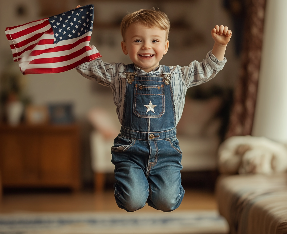 Show your American pride with this heartwarming image of childhood joy and patriotism. Perfect for real estate agents looking to connect with families and highlight the American dream of homeownership, this photo captures the excitement and promise of a bright future.