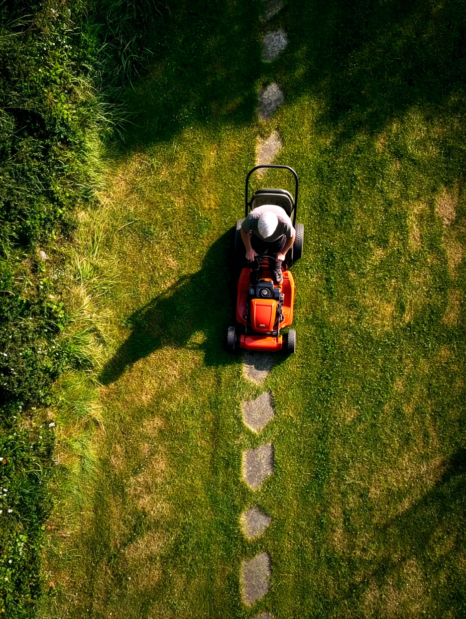 This striking overhead shot captures a person actively pushing a bright orange lawnmower across a lush green lawn, creating a clear demarcation between the freshly cut and uncut grass. A winding path of natural grey stepping stones traverses the verdant landscape, adding an organic element to the scene. Bathed in bright natural daylight, the image boasts vibrant greens and a prominent pop of orange, with strong shadows adding depth and dimension to the modern, top-down composition. Perfect for illustrating concepts of home improvement, gardening, outdoor living, or seasonal tasks, this image is ideal for lifestyle blogs, home and garden websites, marketing campaigns for lawn care services, or editorial content focused on domestic productivity and residential upkeep.