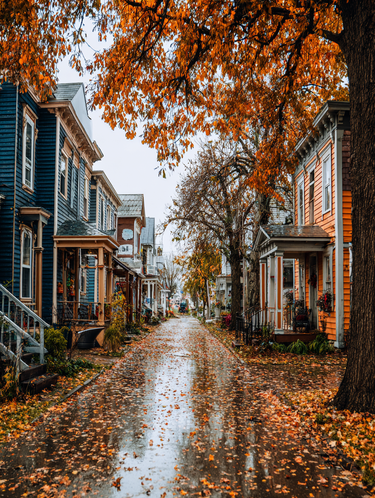 Rainy Autumn Street with Fall Leaves. This is a high-quality stock photo, ideal for real estate agents to use in social media posts, newsletters, and other marketing materials.