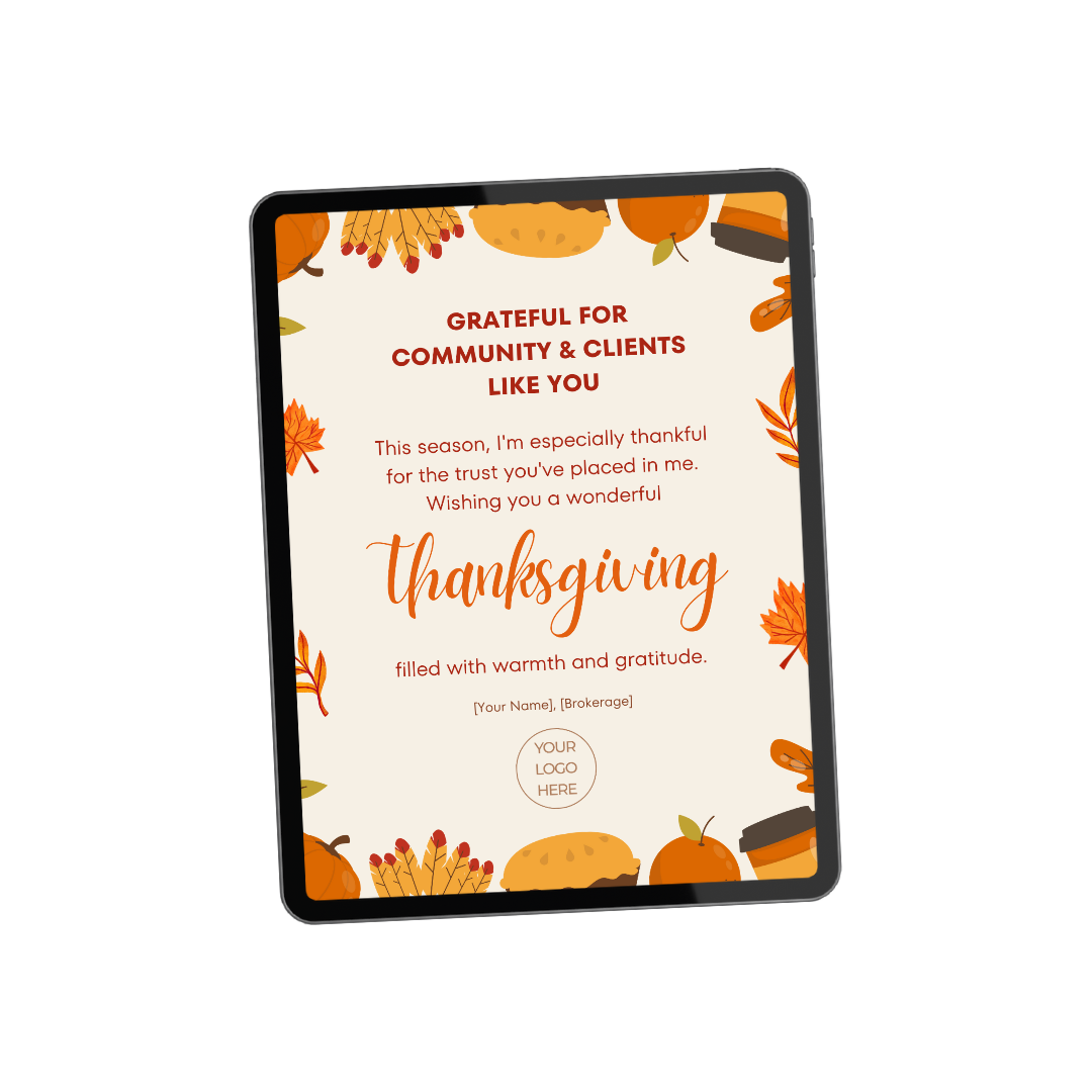 Send a message of gratitude for the fall season and Thanksgiving with this e-card template. It's a thoughtful way to show appreciation to your clients and community, reinforcing relationships during the holiday season.