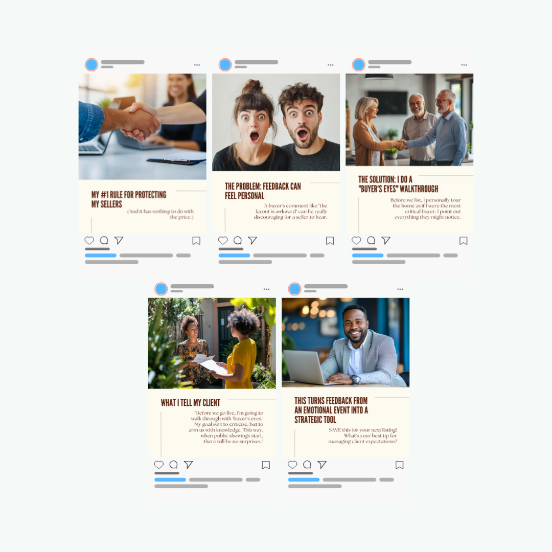 Share this rule for protecting sellers from the emotional rollercoaster of showing feedback. This carousel template explains the "Buyer's Eyes Walkthrough," a strategy that turns feedback from an emotional event into a strategic tool.