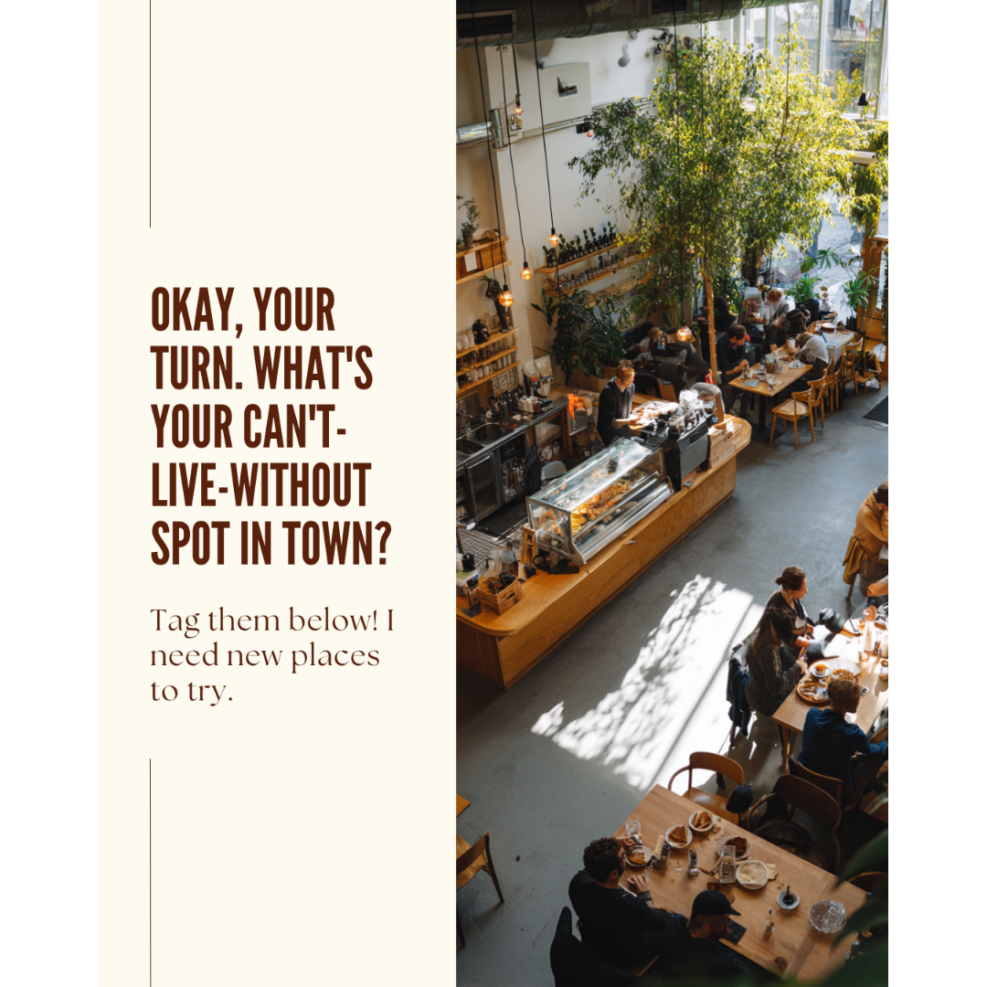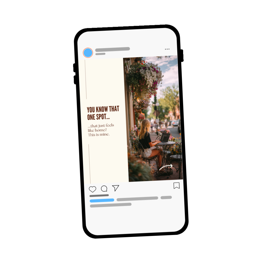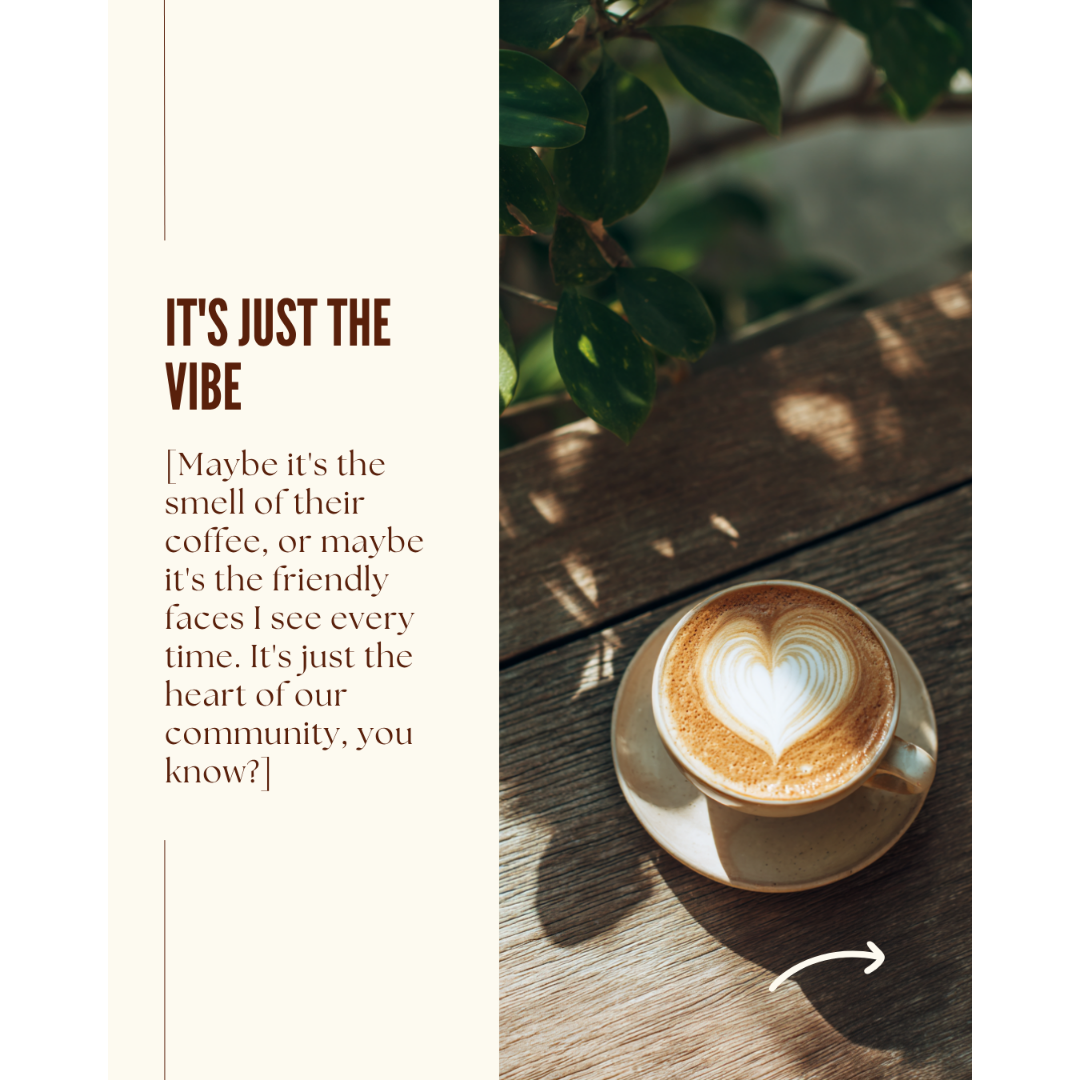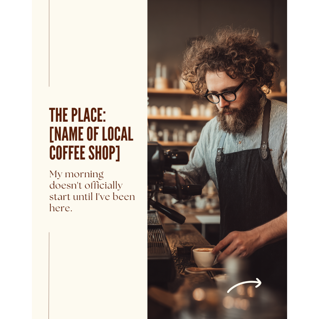 This carousel template is for featuring a local business. Use it to post about a favorite coffee shop, store, or restaurant in your community. It's designed to help you create content that connects with your local audience.