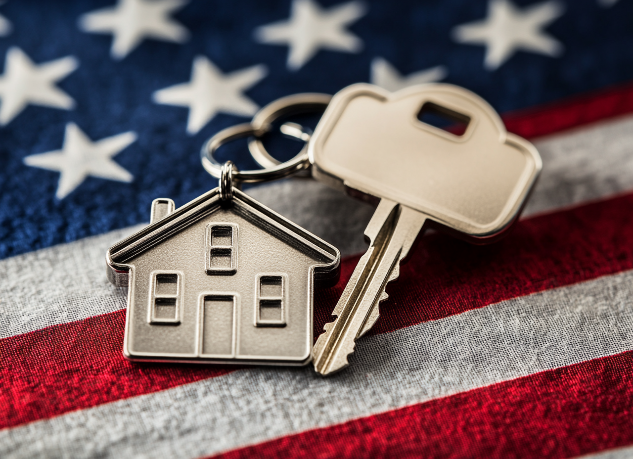 Show your patriotic spirit with this elegant American flag and house keychain, ideal for promoting homeownership. This visually striking image is perfect for marketing materials, social media, or presentations, conveying a sense of national pride and the dream of homeownership.