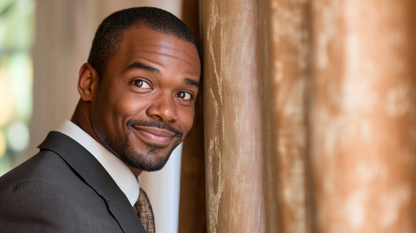 This engaging close-up portrait features a charismatic African American man in a sharp dark suit, crisp white shirt, and patterned tie, leaning casually against a textured golden-brown wall or curtain. His genuine, friendly smile and direct eye contact exude confidence and approachability, illuminated by soft, natural light from the left. The composition offers ample negative space on the right, making it ideal for incorporating text or branding for various marketing materials. This versatile image is perfect for business websites, corporate brochures, social media posts, diversity initiatives, or any campaign seeking to convey warmth, professionalism, and authenticity.