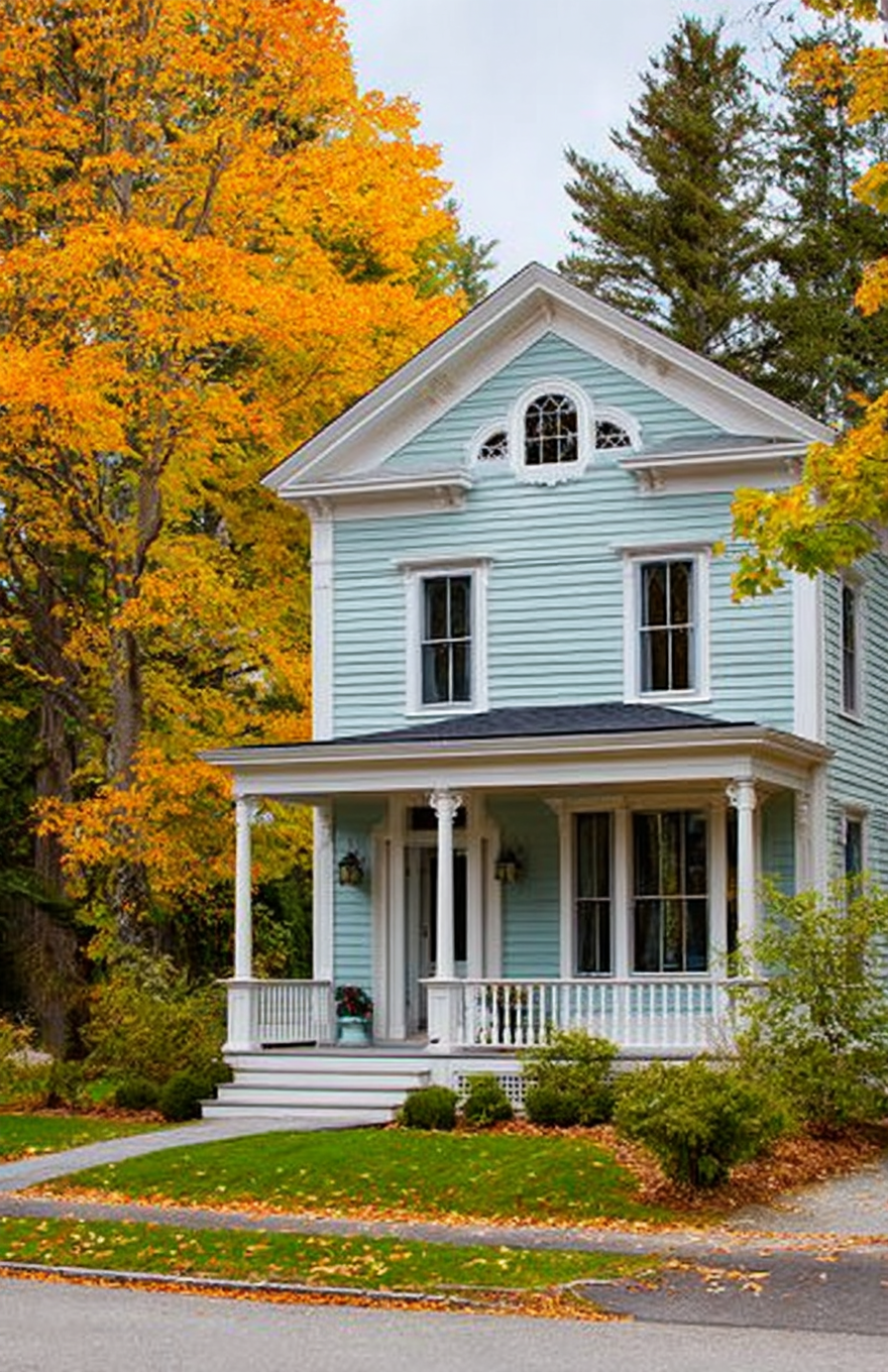This picturesque vertical image showcases a beautiful light blue Victorian or Colonial-style house with classic white trim and a welcoming front porch, complete with decorative columns and a railing. The house is brilliantly framed by a vibrant canopy of golden-orange autumn foliage, creating a stunning contrast with the cool blue siding and dark roof. Scattered fall leaves on the green lawn and paved road enhance the cozy, nostalgic, and inviting atmosphere, perfect for evoking feelings of home and seasonal beauty. This captivating scene is ideal for real estate promotions, home decor features, seasonal marketing campaigns, travel blogs highlighting quaint towns, or any content celebrating the enchanting allure of autumn.