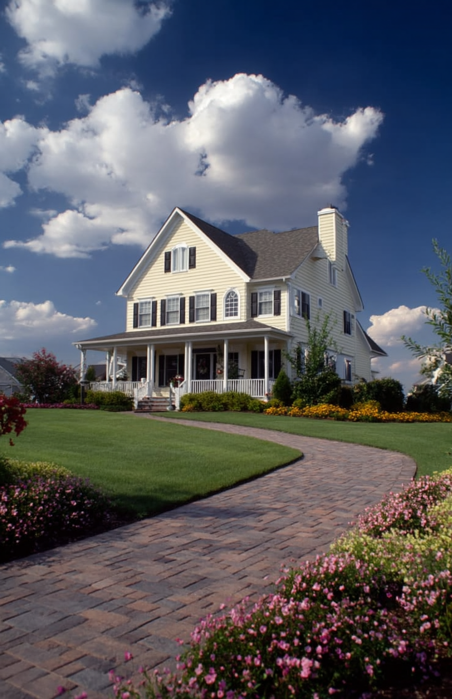 Capture the essence of the American dream with this idyllic home photograph. Featuring a classic yellow house with a wraparound porch and immaculate landscaping, it's an excellent visual for marketing premium family homes and enhancing your real estate listings.