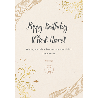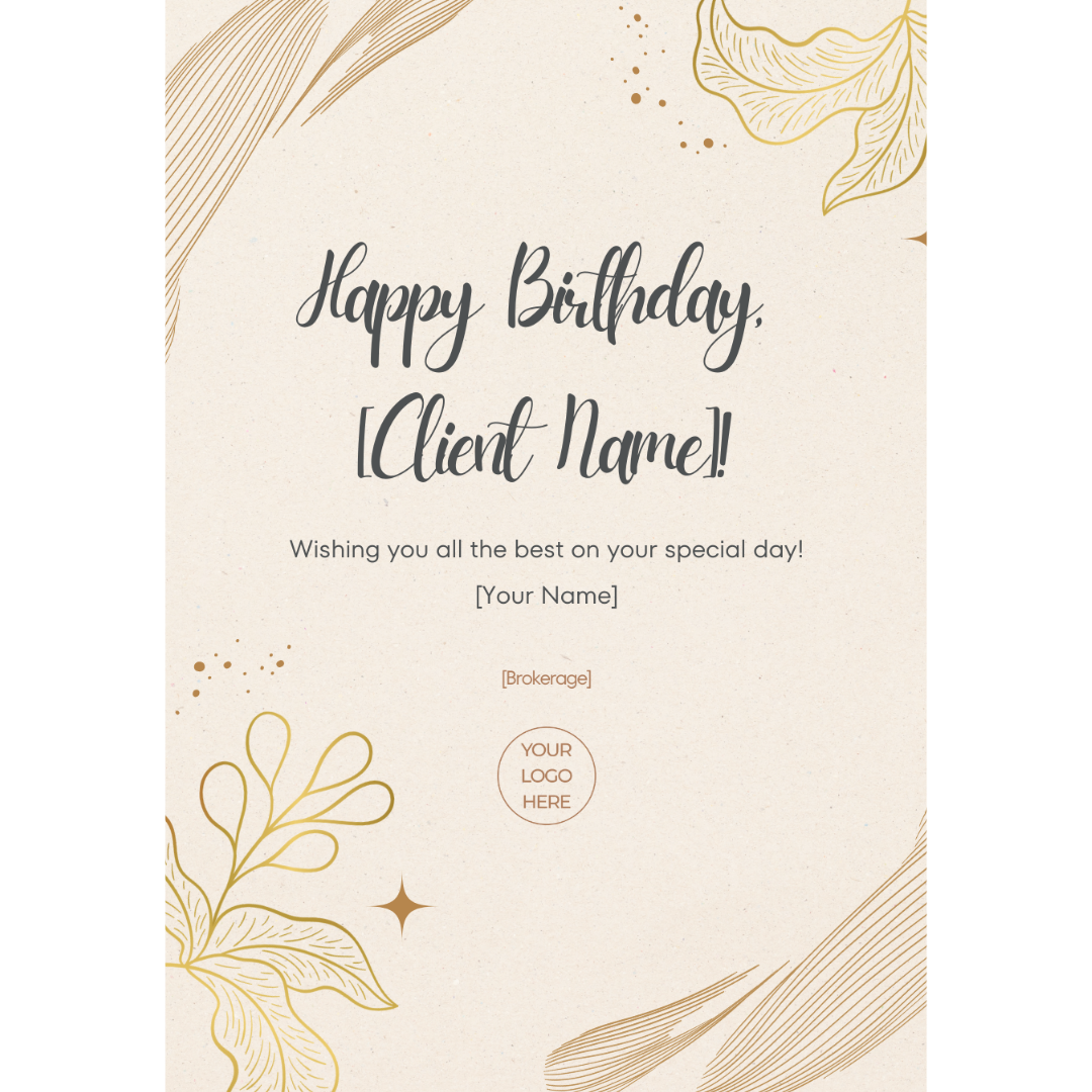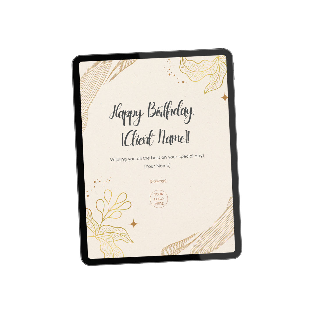 Send a quick, personalized birthday greeting with this textable image template. It's designed for easy sharing via text message or social media DM, allowing you to stay connected with clients on their special day.