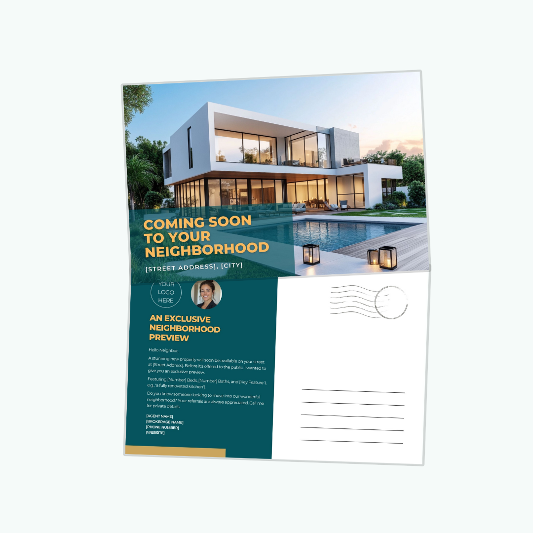 Notify the neighborhood about your upcoming listing with this print-ready 6x9" jumbo postcard template. Designed for farming, this postcard gives neighbors an exclusive preview and helps generate word-of-mouth referrals before the property hits the MLS.