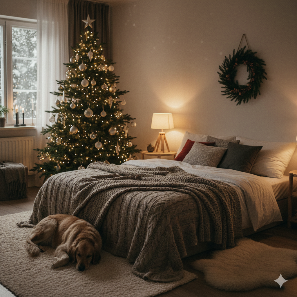 Evoke the warmth and comfort of 'home for the holidays' with this cozy Christmas bedroom stock image. Featuring a decorated tree and a peaceful sleeping dog, it's the perfect visual for your real estate holiday marketing campaigns, social media posts, and client newsletters to connect emotionally with prospective buyers.