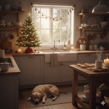 Cozy Christmas Kitchen with Dog - Real Estate Holiday Stock Photo