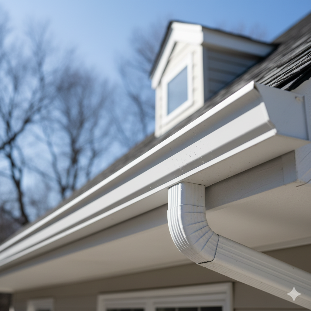 Enhance your real estate marketing with this high-quality stock photo of pristine white gutters, perfect for illustrating home maintenance and curb appeal. This professional image is ideal for blog posts, social media, or newsletters focused on preparing a home for sale or the value of exterior upkeep.