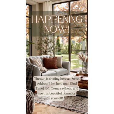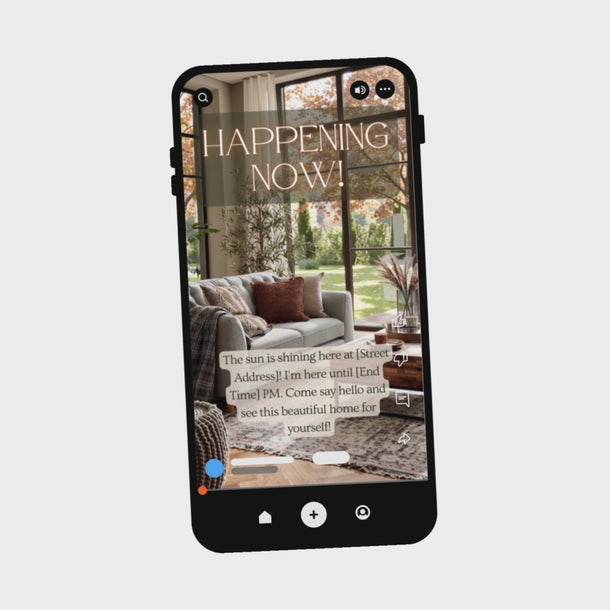 Drive last-minute traffic to your open house with this authentic, "happening now" reel template. Designed for a real-time photo or video, this template provides a clean frame and clear text overlays to remind your followers and create a sense of urgency.
