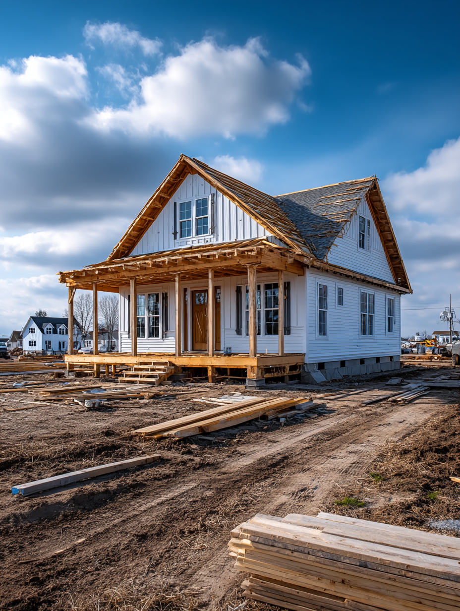Capture the excitement of a new build with this stunning image of a farmhouse-style home under construction. Perfect for showcasing new listings or promoting pre-construction sales to your real estate clients.