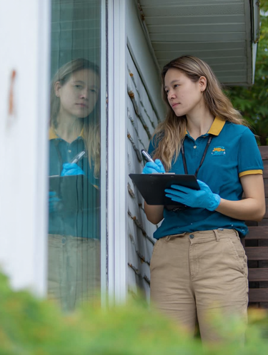 Convey professionalism and thoroughness in your real estate marketing with this high-quality stock photo of a female property inspector at work. Perfect for agents and property managers to illustrate the value of detailed home assessments and dedicated service in their promotional materials.