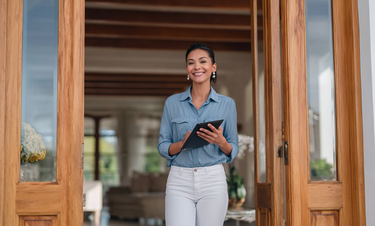 Female Real Estate Agent with Tablet in Luxury Home Doorway
