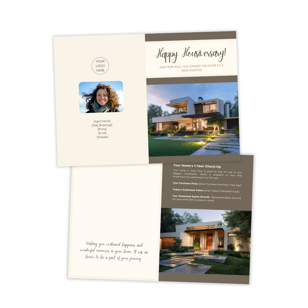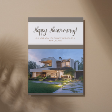 Celebrate your clients' home purchase anniversary with this elegant, print-ready "Happy Housiversary" card. It includes space for a personal message and an infographic-style section to show their estimated equity growth, providing both a thoughtful touch and valuable insight.