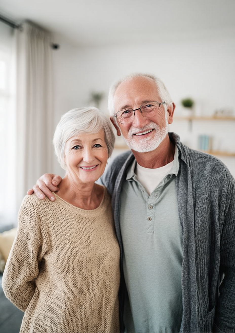 Connect with downsizing seniors, empty nesters, and retirees using this authentic and heartwarming stock imagery. This professional portrait of a happy older couple in a comfortable home setting is perfect for building trust and evoking emotion in your real estate marketing materials targeting the boomers and beyond demographic.