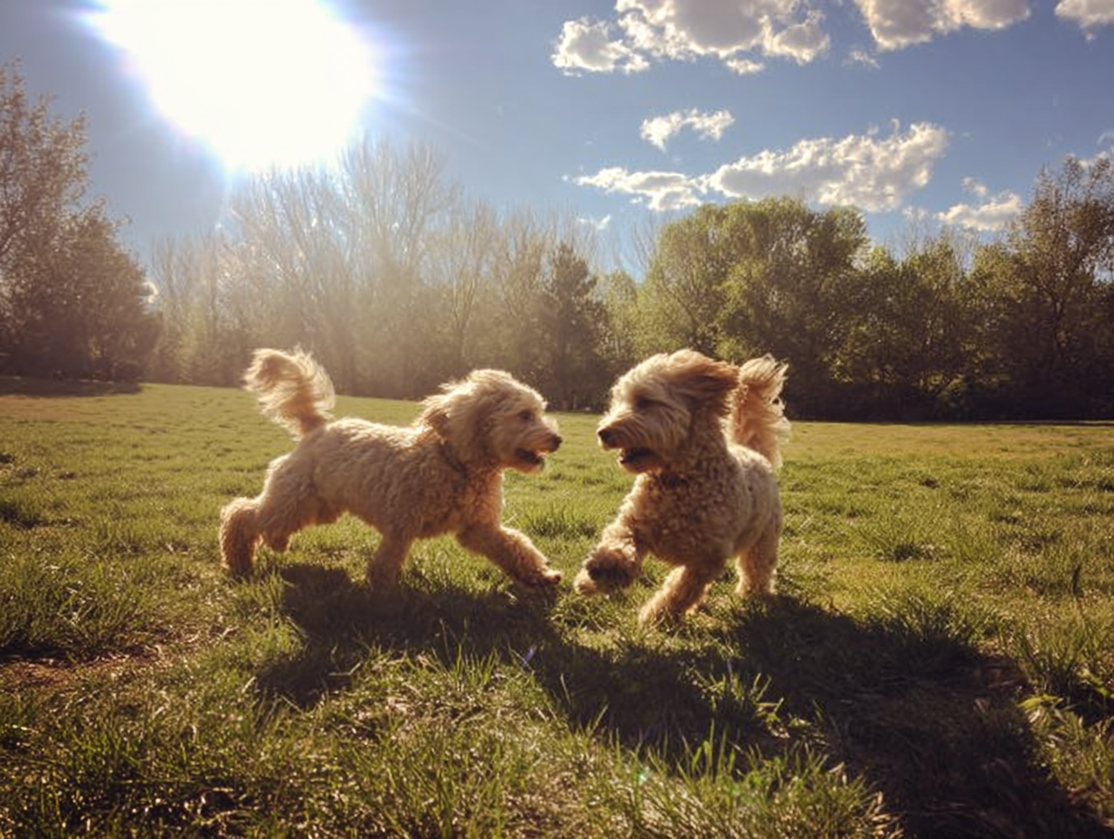 Joyful Golden Doodle Dogs Playing in Sunny Park