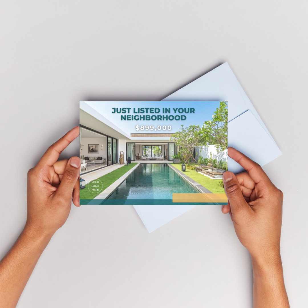Blanket the neighborhood with a professional "Just Listed" announcement. This 6x9" jumbo postcard template is designed for real estate farming, showcasing your new listing to potential sellers, driving traffic to your open house, and reinforcing your status as the area expert.