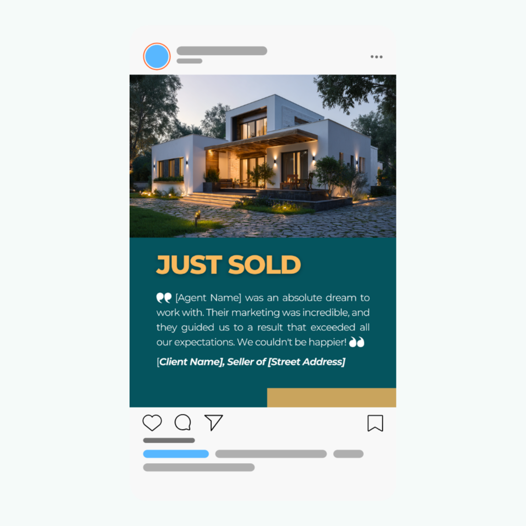 Build powerful social proof with this "Just Sold" template that features a client testimonial. This graphic combines the success of a sale with a glowing review, making it one of the most effective marketing assets for attracting new clients.