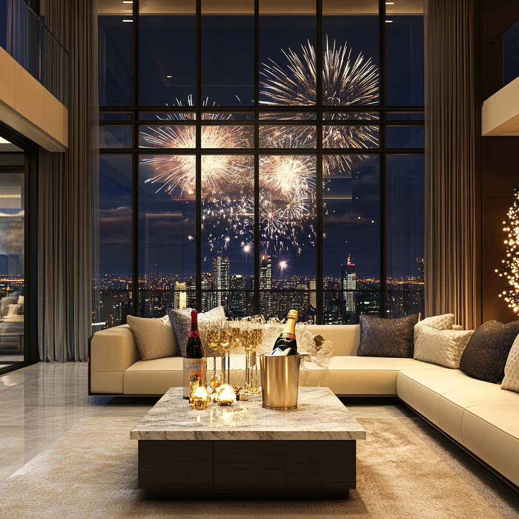Home All Images Luxurious Penthouse Living Room with Fireworks Celebration