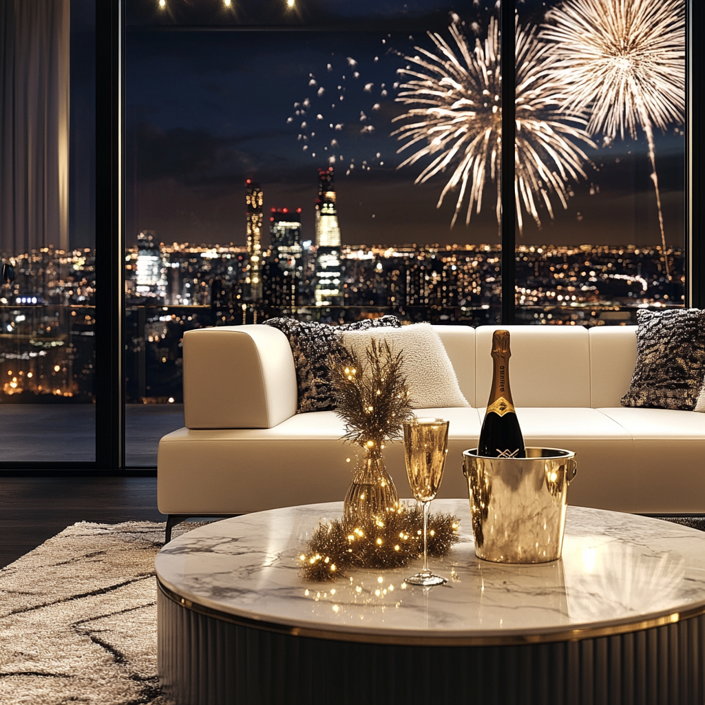 Capture the essence of sophisticated celebration with this stunning image of a modern luxury apartment overlooking a vibrant city skyline illuminated by dazzling fireworks. The foreground features an elegant marble coffee table adorned with a chilled bottle of champagne, a golden flute, and warm fairy lights nestled within a decorative vase, creating a cozy yet opulent atmosphere. This image perfectly conveys a festive, upscale mood, ideal for showcasing luxury living, holiday celebrations, real estate promotions, or any marketing campaign aiming for elegance and aspiration. Perfect for social media posts, website headers, advertising upscale products, or editorial content related to New Year's Eve and special occasions.