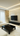 - Sleek material contrast featuring glossy wall panels with mirrored strips and matte black furniture.