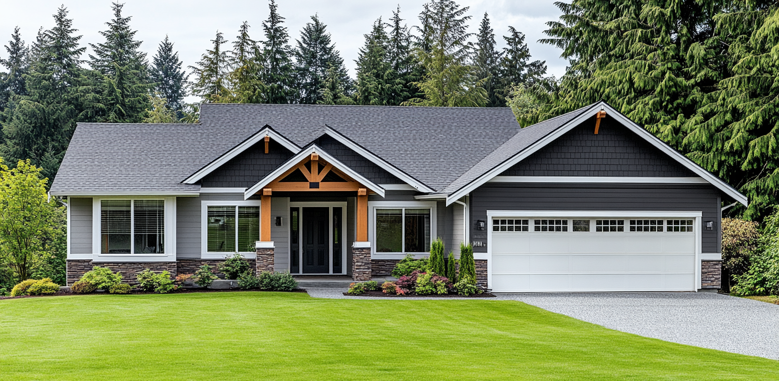 Capture the essence of contemporary suburban living with this inviting exterior shot of a modern single-story home. The house features a sophisticated palette of light gray siding, dark charcoal shingle accents on the gables, a dark gray roof, and natural wood beams over the elegant entryway, beautifully complemented by white trim and stone details. A vibrant, well-manicured green lawn stretches across the foreground, while a backdrop of lush evergreen trees and a soft, overcast sky creates a serene and aspirational atmosphere. This pristine image is perfect for real estate listings, home design inspiration, architectural portfolios, property development marketing, and homeownership-related content.
