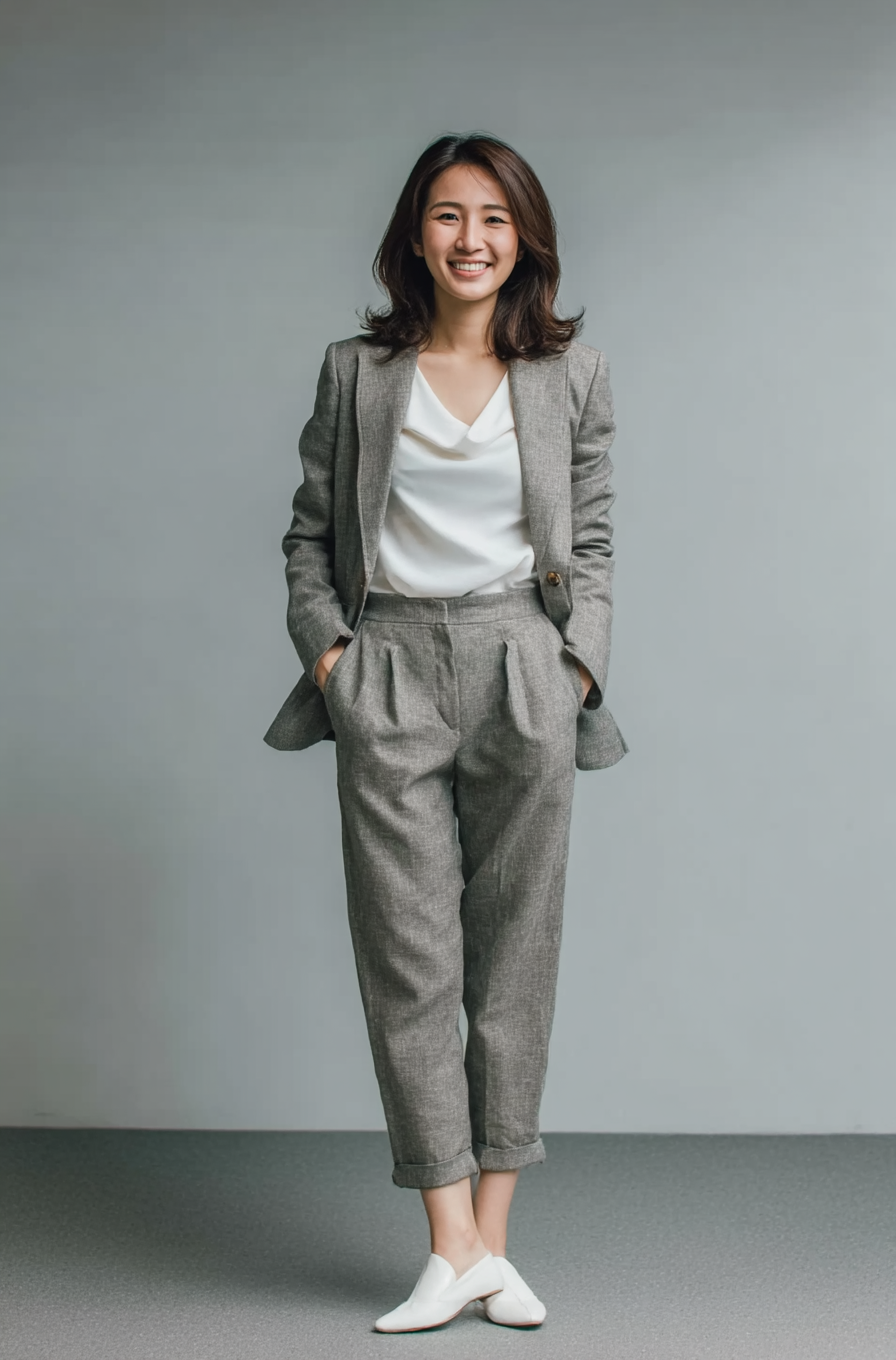 Elevate your professional wardrobe with this effortlessly chic grey linen suit, designed for the modern real estate agent on the go. The breathable fabric and relaxed fit ensure all-day comfort during property viewings, while the tailored silhouette provides a polished and trustworthy appearance for client meetings. This versatile two-piece set is a timeless investment for building a confident and stylish personal brand.