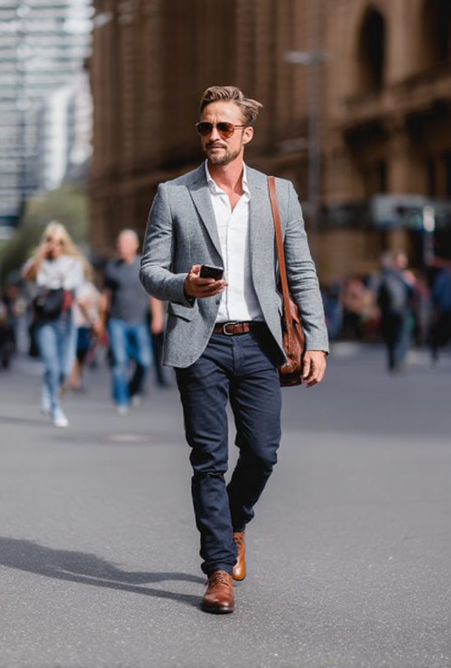 - Smart-casual professional attire (grey blazer, dark trousers).