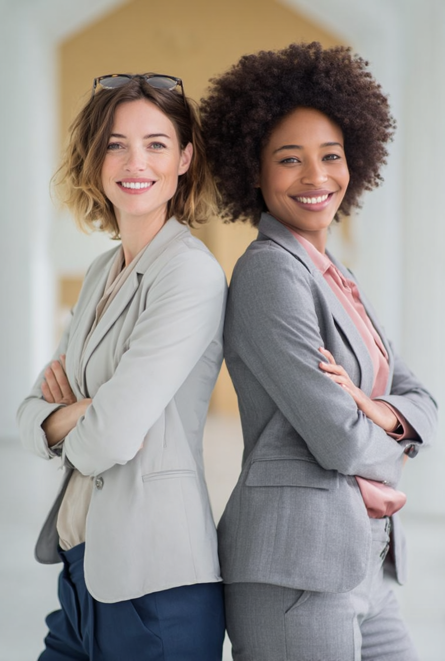 Convey strength and collaboration with this dynamic image of two confident professionals standing back-to-back. Perfect for showcasing your real estate team's combined expertise and dedication to client success on your website or marketing materials. Elevate your brand with visuals that exude reliability and modern professionalism.