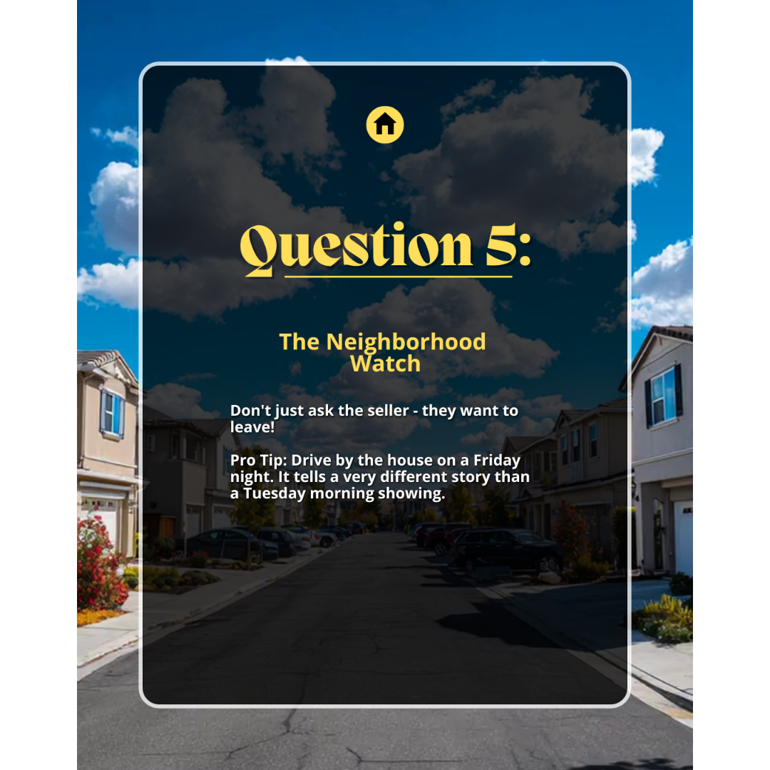- Slide 6: THE VIBE - The Neighborhood Watch (Drive by on a Friday night)