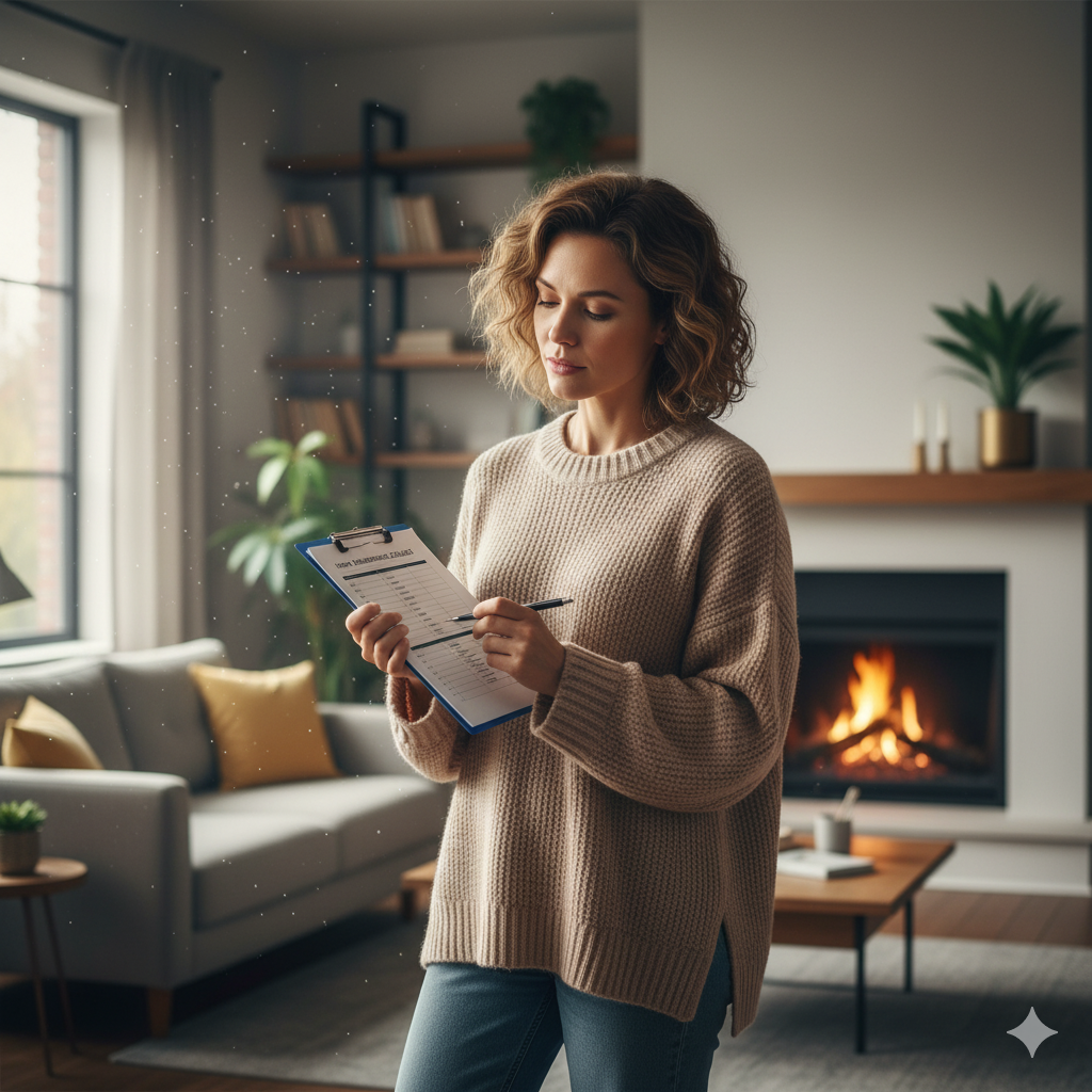 Elevate your real estate brand with this high-quality stock photo of a professional woman conducting a home consultation in a cozy, fire-lit living room. Perfect for showcasing your expertise in home staging, client meetings, or property evaluations, this warm and inviting image will resonate with potential buyers and sellers.