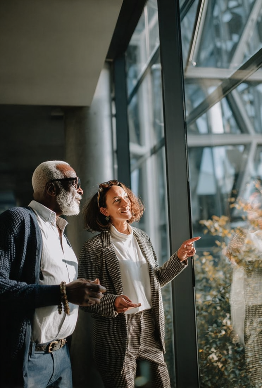 Capture the moment of vision and discovery with this professional stock photo, perfect for your real estate marketing. This high-quality image of an agent showing a modern property to a client exudes competence and aspiration, making it an ideal choice for website banners, brochures, and social media content aimed at luxury buyers.