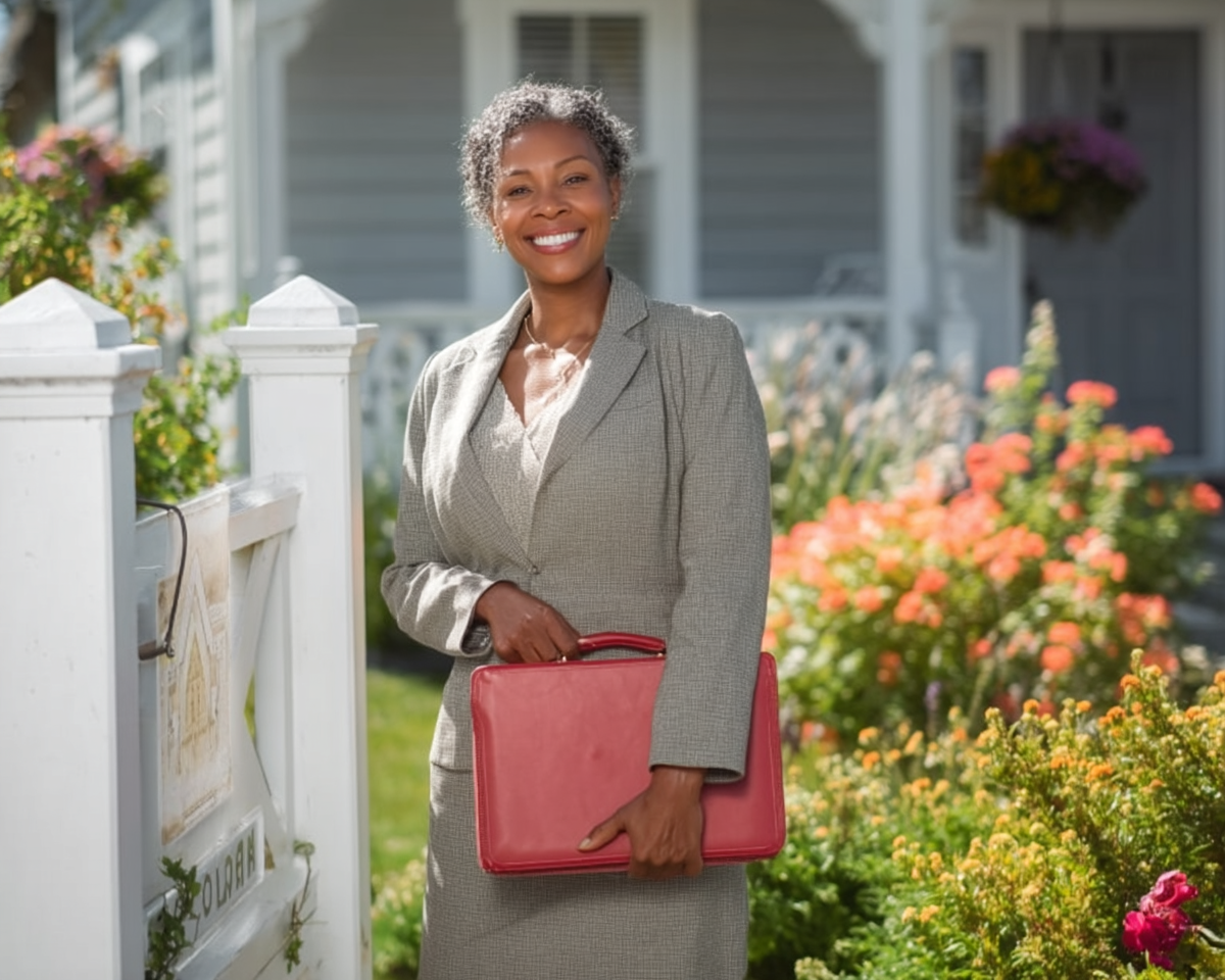 Project confidence and approachability with this professional stock image, perfect for real estate marketing. The combination of the classic suit, bold red briefcase, and welcoming home background creates a trustworthy and successful image that resonates with clients. Use this to enhance your brand across websites, social media, and printed materials.