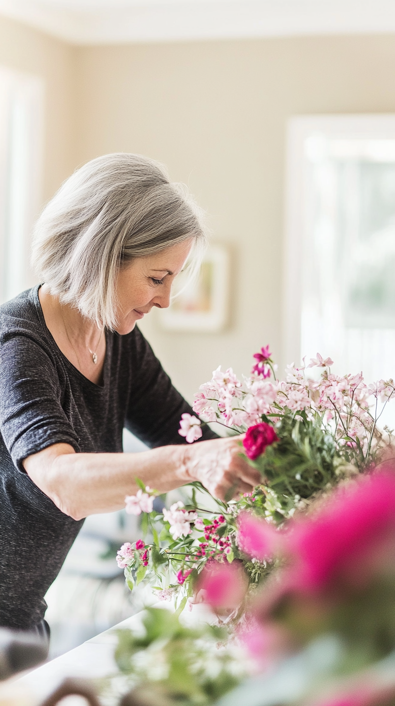 Capture the serene beauty of a mature woman mindfully arranging a vibrant bouquet of pink and fuchsia flowers. Her gentle smile and focused gaze convey a sense of calm enjoyment and passion for floristry, bathed in soft, natural light within a warm, inviting home setting. The shallow depth of field beautifully highlights the intricate details of the colorful blooms and her elegant hands, while a blurred foreground adds artistic depth. This heartwarming image is perfect for illustrating themes of hobbies, home decor, mindful living, aging gracefully, or DIY projects, making it ideal for social media, website headers, or marketing campaigns.
