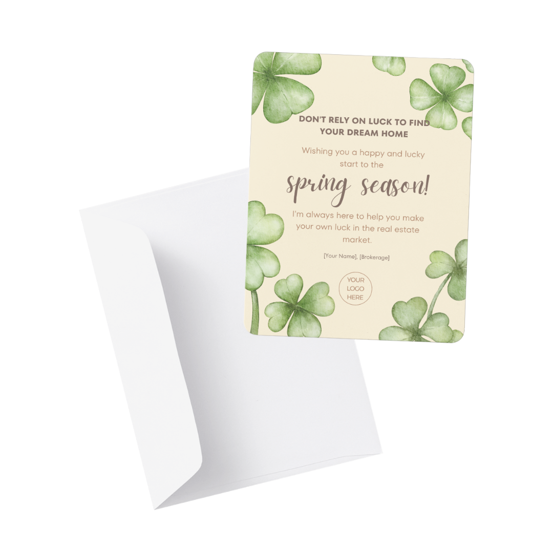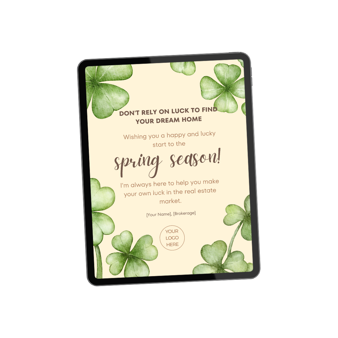Send a cheerful greeting for the spring season and St. Patrick's Day with this e-card template. It's a lighthearted way to connect with your clients and sphere of influence, wishing them luck and reminding them you're their real estate resource.