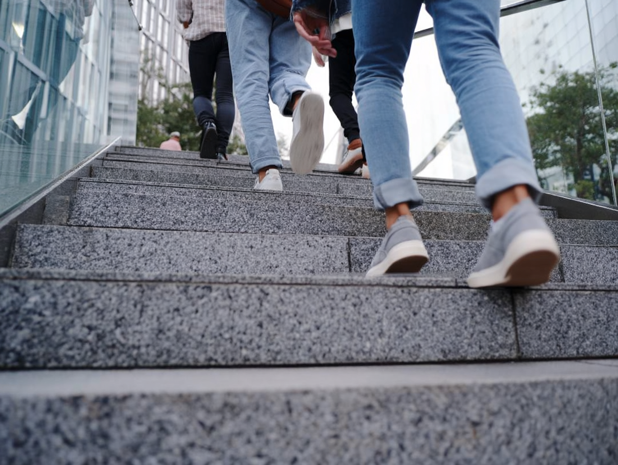 This dynamic low-angle photograph captures the purposeful movement of several individuals as they ascend a wide, modern set of speckled gray granite stairs in a vibrant urban environment. The close-up perspective emphasizes their casual fashion, showcasing various pairs of blue jeans and stylish sneakers in shades of white, gray, and dark hues, symbolizing progress and forward momentum. With a sleek glass building reflecting cool tones on the left and subtle greenery in the background, this image perfectly encapsulates contemporary city life. It's ideal for marketing campaigns, website banners, and social media posts promoting concepts like ambition, teamwork, success, urban development, or daily routines.